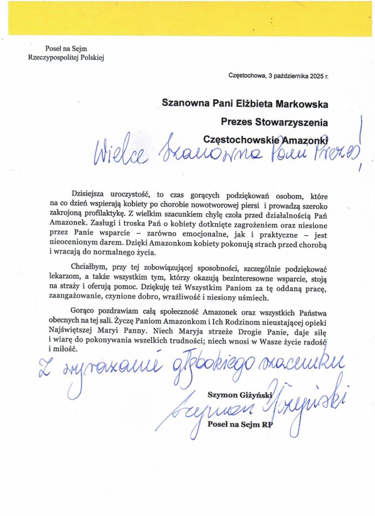 na co dzień wspierają kobiety po chorobie nowotworowej piersi i prowadzą szeroko zakrojoną profilaktykę. Z wielkim szacunkiem chylę czoła przed działalnością Pań Amazonek. Zasługi i troska Pań o kobiety dotknięte zagrożeniem oraz niesione przez Panie wsparcie – zarówno emocjonalne, jak i praktyczne – jest nieocenionym darem. Dzięki Amazonkom kobiety pokonują strach przed chorobą